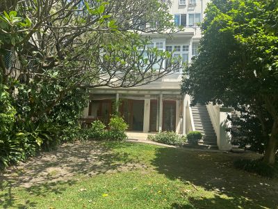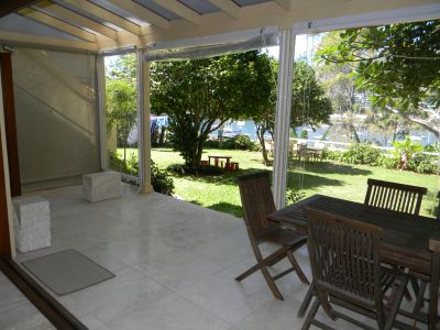 Expansive shared garden area leading down to the water's edge