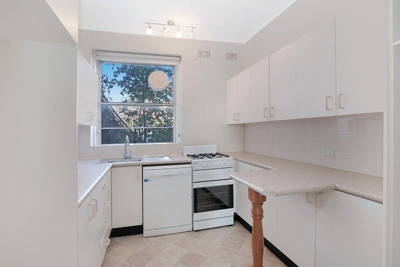 The kitchen features a gas cooktop, dishwasher, and ample storage. Both double bedrooms include built-in wardrobes.